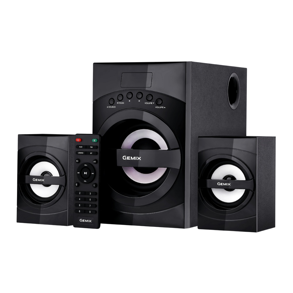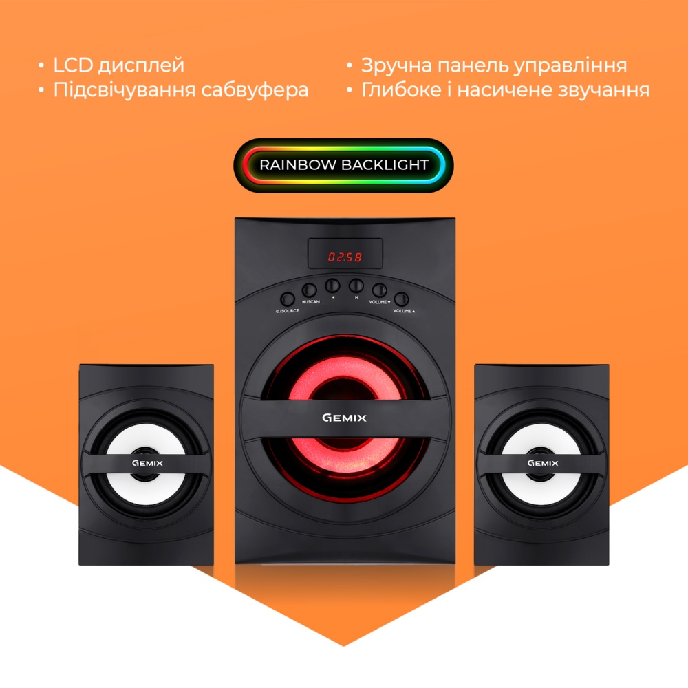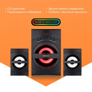 Мультимедійна акустична система Gemix SB-130X з відмінним і насиченим звучанням. Загальна потужність 56 Вт достатня для прослуховування музики, спільному перегляду фільмів, для озвучування ігор. Класичні форми акустичної системи гармонійно доповнені чорною глянсовою панеллю сабвуфера - модель відмінно виглядатиме у вас вдома. А підсвічування сабвуфера створить настрій та святкову атмосферу. Панель управління і дисплей зручно розташовані на передній панелі сабвуфера. Модель оснащена вбудованим USB портом, Карт Рідером для відтворення звуку з зовнішніх джерел, а також FM приймачем з пам'яттю до 100 станцій.
