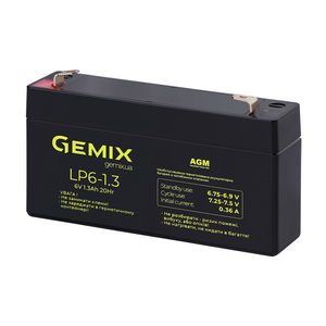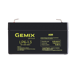 Свинцево-кислотна акумуляторна батарея Gemix серії LP. Скловолоконний абсорбуючий сепаратор (технологія AGM), вбирає електроліт та зменшує корозію електрода, ефективно збільшує термін служби та стійкість батарей. Батареї переносять перерозряд, перезаряд та вібрацію, а також допускають тривале зберігання. Використання товстих і важких свинцево-кальцієвих пластин дозволяє досягти високої надійності роботи та тривалого терміну служби батарей у режимах постійної підзарядки та циклічного використання.
