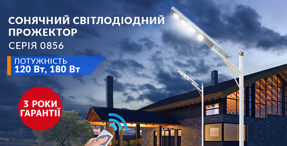 Сонячний світлодіодний вуличний ліхтар для освітлення невеликих площ, дворів, парковок, стежок, тротуарів та інших відкритих майданчиків. Корпус прожектора виконаний з алюмінію, має ступінь захисту від вологи і пилу IP65. Акумулятор заряджається від сонячної панелі. Час повної зарядки 6-8 годин. Прожектор забезпечує 20 - 24 години безперервного освітлення. Зручне управління за допомогою дистанційного пульта. Вбудований датчик освітлення забезпечує автоматичне відключення освітлення вранці, і початок заряду батарей, а так само включення освітлення в сутінках. Датчик руху, заощаджує заряд батареї, при відсутності руху прожектор світить на 30% своєї потужність, при фіксуванні руху, включається на повну потужність
