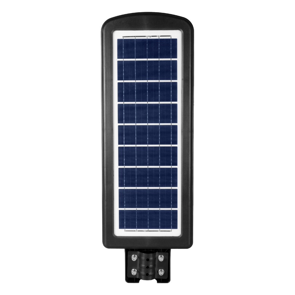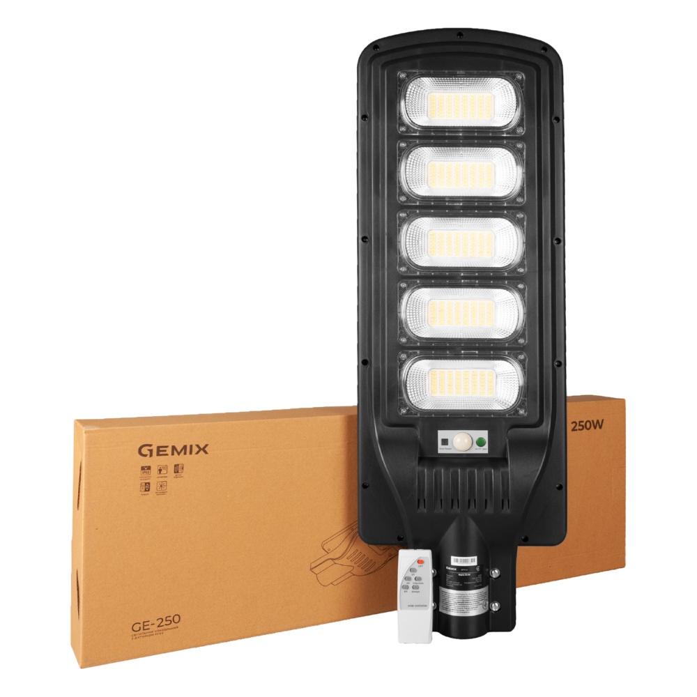 Сонячний вуличний LED світильник потужністю 250 Вт, з вбудованим акумулятором, який заряджається від сонячної панелі та забезпечує автономне освітлення для місць, де не доступно живлення від електромережі. Добре підходить для організації освітлення перед входом в під'їзд, будинок, гараж, для парків, терас, спортивних майданчиків. Призначені для розміщення на вулиці, в суворих погодних умовах, обладнані захистом від пилу і вологи. Обладнані датчиком руху. При відсутності руху прожектор світить на 30% своєї яскравості, при спрацьовуванні датчика включається на повну потужність. Керувати роботою прожектора можна дистанційно за допомогою пульта в комплекті. Світильник розрахований на 30-36 годин безперервної роботи, а час повної зарядки - 6-8 годин.