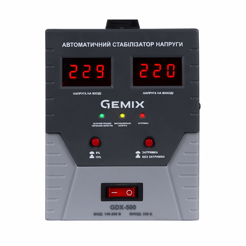 Стабілізатор релейного типу GEMIX GDX призначені для підтримки стабільної напруги в однофазних мережах 220В і частотою 50 Гц, для живлення побутових приладів. Похибка стабілізації на виході складає всього 10%. Забезпечують високу точність вихідної напруги і швидкість стабілізації. Сумісні з усіма видами побутової, AV і комп'ютерної техніки.