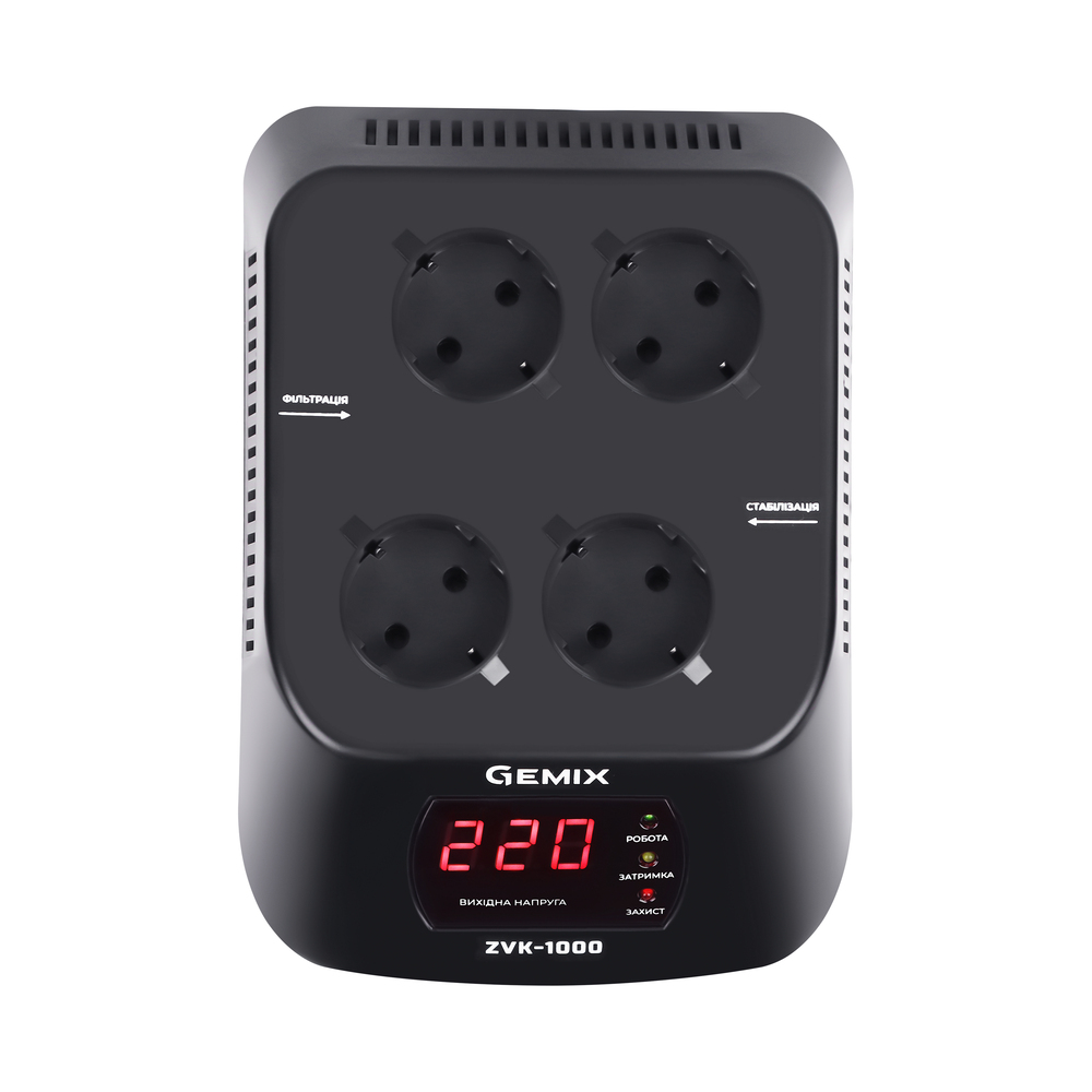 Стабілізатори релейного типу GEMIX ZVK-1000 призначені для підтримки стабільної напруги в однофазних мережах 220В та частотою 50 Гц, для живлення AV, комп'ютерної техніки та побутових приладів. Розглянутий стабілізатор напруги не потребує додаткового монтажу завдяки зручній конструкції полочного типу.